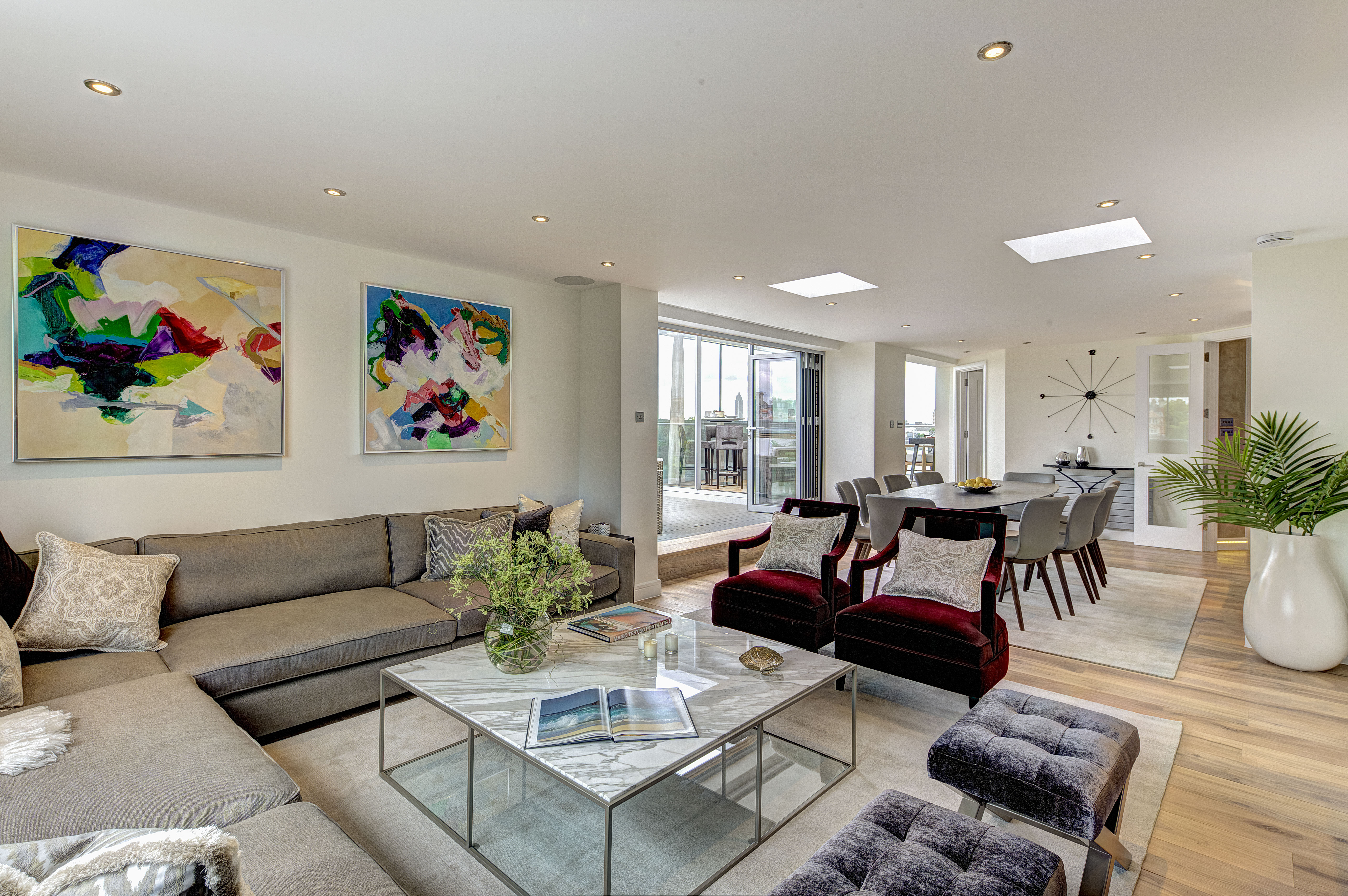 For this penthouse project, we designed the upholstery (beds, headboards, sofas, armchairs and bar stools), some of the tables and the fitted media unit.