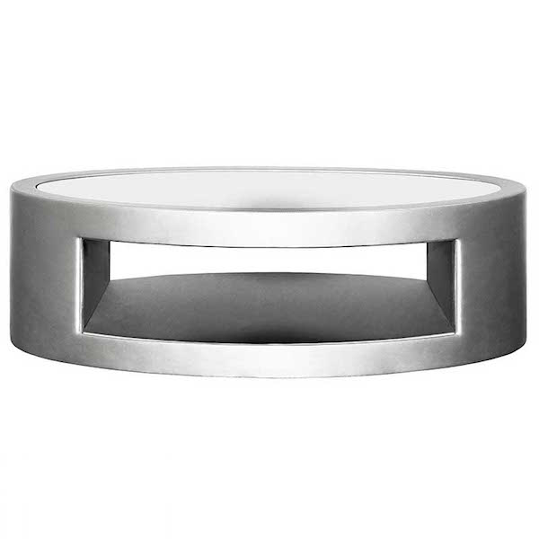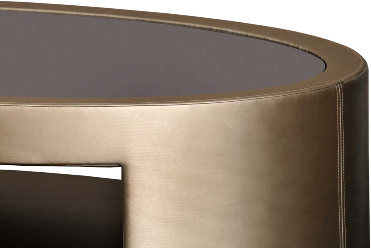 The Espresso coffee table is oval shaped with a textured mirror inlay and cubby hole for convenient storage. A true statement piece.